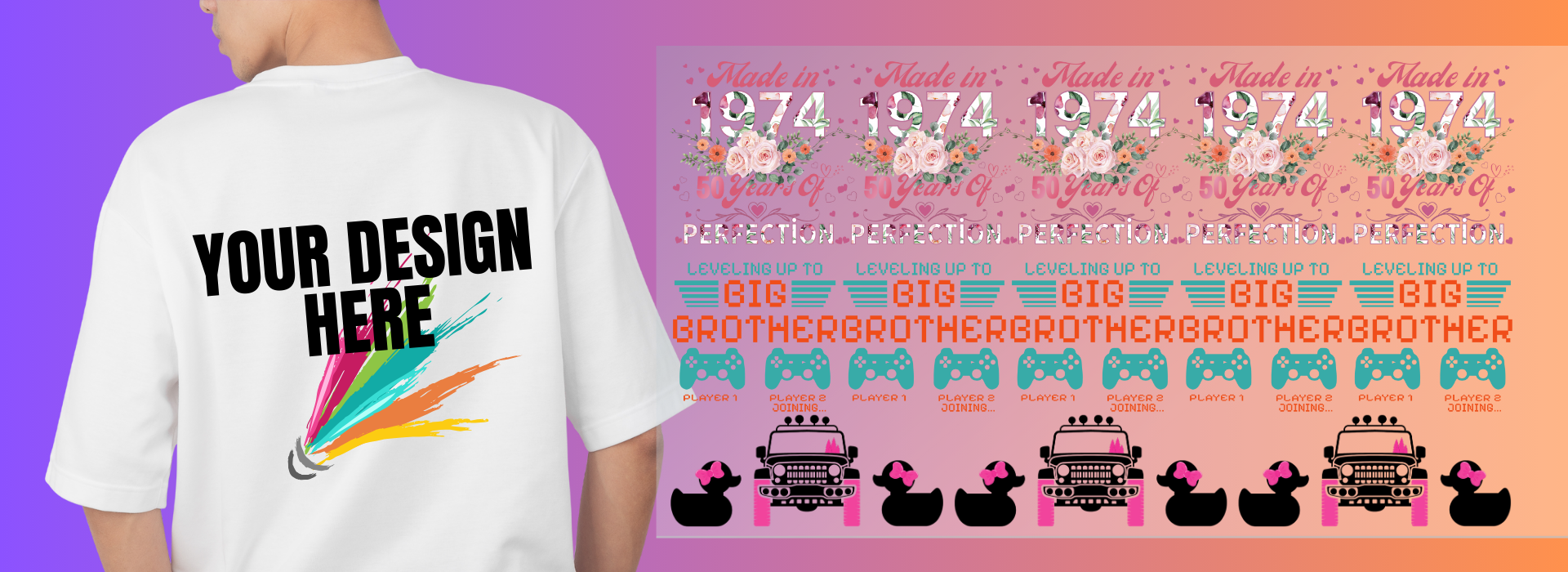 - Tailored Solutions for Everyone: We provide everything from custom DTF designs to bulk DTF gang sheets tailored to your specific needs.