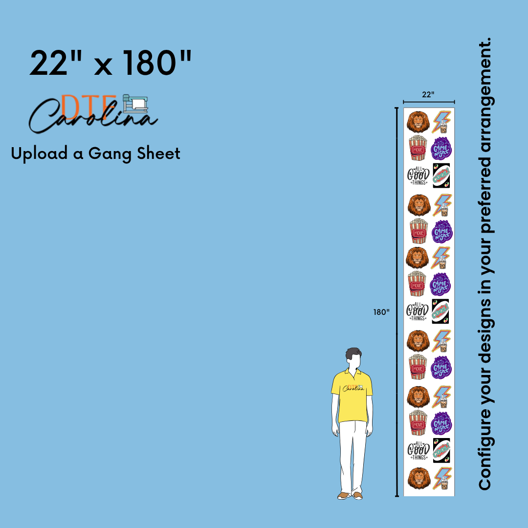 A gang sheet in the context of DTF (Direct-to-Film) printing refers to a large sheet of transfer film that contains multiple designs or images arranged together. Instead of printing individual designs separately, a gang sheet allows multiple designs to be printed simultaneously on a single sheet, optimizing printing efficiency and reducing material waste.